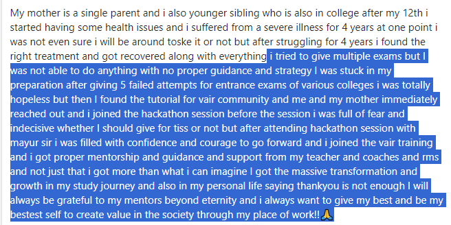 You can be rest assured to crack the entire process of getting into Top Program of TISS after getting 1-2-1 Mentorship, customised training, holistic profile transformation.